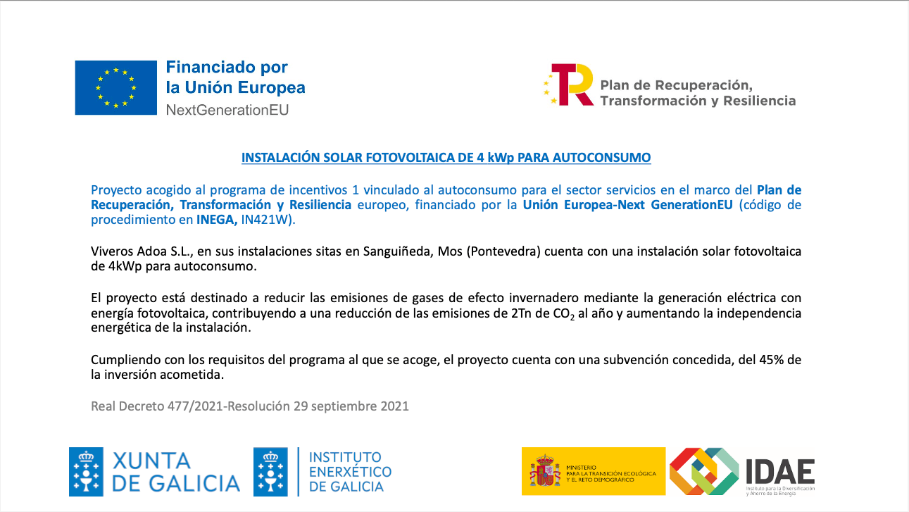 La instalación de autoconsumo fotovoltaico realizada en Viveros Adoa permite cubrir un 40% de la demanda energética de los diferentes consumos, aprovechando la radiación solar incidente en los módulos solares.